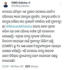 ଭୁବନେଶ୍ୱର:- କଟକ ସହରର ମଣିସାହୁ ଛକ ନିକଟରେ ଥିବା ହାଡ଼ିବନ୍ଧୁ ସ୍କୁଲ ନିକଟରେ ପୁରୁଣା କୋଠା ଭୁଶୁଡ଼ିବାରୁ ବସ୍ତିରେ ରହୁଥିବା ୩ ଜଣଙ୍କର ମୃତ୍ୟୁ ଘଟିବା ନେଇ ମୁଖ୍ୟମନ୍ତ୍ରୀ ମୋହନ ଚରଣ ମାଝୀ ଗଭୀର ଶୋକ ପ୍ରକାଶ କରି ନିଜ X ପେଜ୍ ରେ ମୃତକଙ୍କ ପରିବାର ପ୍ରତି ସମବେଦନା ଜଣାଇବା ସହ ଆହତଙ୍କ ଉତ୍ତମ ଚିକିତ୍ସା ସରକାର ଯୋଗାଇ ଦେଇଛନ୍ତି ବୋଲି ମଧ୍ୟ ସୂଚନା ଦେଇଛନ୍ତି । ଏବଂ ମୃତକ ଅବଦୁଲ ମୁଜାହିଦ, ଅବଦୁଲ ଜାହିଦ ଓ ଅବଦୁଲ ଜଲିଲଙ୍କ ପରିବାରକୁ ସିଏମ ରିଲିଫ ପାଣ୍ଠିରୁ ଚାରି ଲକ୍ଷର ଅନୁକମ୍ପା ମୂଳକ ସହାୟତା ରାଶି ପ୍ରଦାନ ପାଇଁ ଘୋଷଣା କରିଛନ୍ତି ।