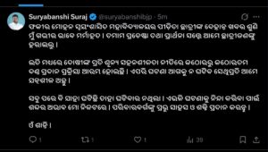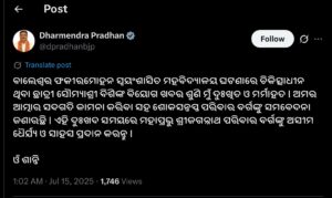 ସେପଟେ ବାଲେଶ୍ବର ଫକୀରମୋହନ କଲେଜରେ ଆତ୍ମାହୁତି ଉଦ୍ଯମ କରିଥିବା ଛାତ୍ରୀ ସୌମ୍ଯାଶ୍ରୀ ବିଶିଙ୍କ ଦେହାନ୍ତରେ ଦୁଃଖ ପ୍ରକାଶ କରିଛନ୍ତି ମୁଖ୍ଯମନ୍ତ୍ରୀ ମୋହନ ଚରଣ ମାଝୀ। କହିଲେ, ଛାତ୍ରୀଙ୍କ ପରିବାର ଲୋକଙ୍କ ସହ ସରକାର ଦୃଢ଼ ଭାବରେ ଛିଡ଼ା ହୋଇଛନ୍ତି। ସେହିପରି ଘଟଣାରେ ଦୁଃଖ ପ୍ରକାଶ କରିଛନ୍ତି ଧର୍ମେନ୍ଦ୍ର ପ୍ରଧାନ । ଏହି ଦୁଃଖଦ ସମୟରେ ମହାପ୍ରଭୁ ଶ୍ରୀଜଗନ୍ନାଥ ପରିବାର ବର୍ଗଙ୍କୁ ଅସୀମ ଧୈର୍ଯ୍ୟ ଓ ସାହସ ପ୍ରଦାନ କରନ୍ତୁ ବୋଲି କହିଛନ୍ତି କେନ୍ଦ୍ରମନ୍ତ୍ରୀ ।