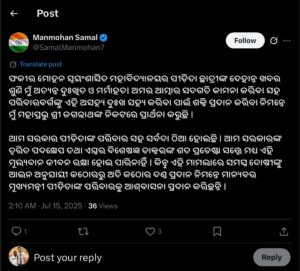 ଅନ୍ୟପଟେ ଦୁଃଖ ପ୍ରକାଶ କରି ଉଚ୍ଚଶିକ୍ଷା ମନ୍ତ୍ରୀ ସୂର୍ଯ୍ୟବଂଶୀ ସୂରଜ କହିଛନ୍ତି ଫକୀର ମୋହନ ସ୍ୱୟଂଶାସିତ ମହାବିଦ୍ୟାଳୟର ପୀଡ଼ିତା ଛାତ୍ରୀଙ୍କ ଦେହାନ୍ତ ଖବର ଶୁଣି ମୁଁ ଗଭୀର ଭାବେ ମର୍ମାହତ । ତମାମ ପ୍ରଚେଷ୍ଟା ତଥା ପ୍ରାର୍ଥନା ସତ୍ତ୍ୱେ ଆମେ ଛାତ୍ରୀଜଣଙ୍କୁ ହରାଇଲୁ । ସେହିପରି ଆମ ସରକାର ପୀଡ଼ିତାଙ୍କ ପରିବାର ସହ ସର୍ବଦା ଠିଆ ହୋଇଛି । ଆମ ସରକାରଙ୍କ ତ୍ୱରିତ ପଦକ୍ଷେପ ତଥା ଏମ୍ସର ବିଶେଷଜ୍ଞ ଡାକ୍ତରଙ୍କ ଶତ ପ୍ରଚେଷ୍ଟା ସତ୍ତ୍ୱେ ମଧ୍ୟ ଏହି ମୂଲ୍ୟବାନ ଜୀବନ ରକ୍ଷା ହୋଇ ପାରିନାହିଁ ।ଏହି ମାମଲାରେ ସମସ୍ତ ଦୋଷୀଙ୍କୁ ଆଇନ ଅନୁଯାୟୀ କଠୋରରୁ ଅତି କଠୋର ଦଣ୍ଡ ପ୍ରଦାନ କରାଯିବ ବୋଲି କହିଛନ୍ତି ବିଜେପି ରାଜ୍ୟ ସଭାପତି ମନମୋହନ ସାମଲ ।