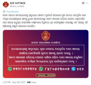 ସୋସିଆଲ ମିଡିଆରେ ଏକ୍ସରେ ସୂଚନା ଦେଇ କଟକ ଡିସିପି କହିଛନ୍ତି, କଟକ ସହରର ଜନସାଧାରଣଙ୍କୁ ଅନୁରୋଧ ଆଗାମୀ ପୂଜାପର୍ବ ଉପଲକ୍ଷେ ପୂଜା ନାମରେ ବଳପୂର୍ବକ ଚାନ୍ଦା ସଂଗ୍ରହ କରାଯାଉଥିଲେ ଆମକୁ ତୁରନ୍ତ ଅବଗତକରନ୍ତୁ। ଆମେ ଆପଣଙ୍କ ପରିଚୟ ଗୋପନ ରଖିବାସହିତ ଚାନ୍ଦା ଆଦାୟ କରୁଥିବା ଅସାମାଜିକ ବ୍ୟକ୍ତିମାନଙ୍କ ବିରୁଦ୍ଧରେ ଦୃଢ କାର୍ଯ୍ୟାନୁଷ୍ଠାନ ନେଉଅଛୁ ଏବଂ ଆଗକୁ ଏହି ଅଭିଯାନକୁ ଆହୁରି ଜୋରଦାର କରାଯିବ।