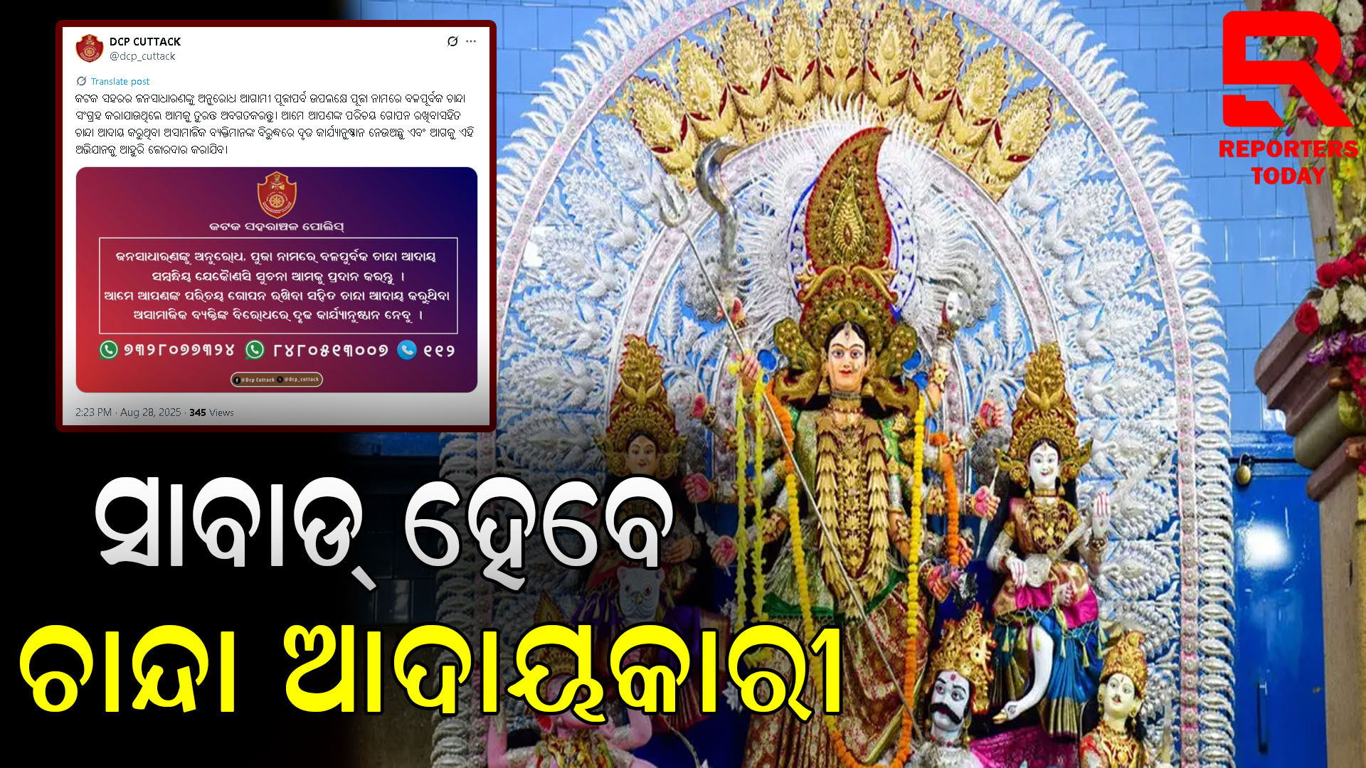 ସୋସିଆଲ ମିଡିଆରେ ଏକ୍ସରେ ସୂଚନା ଦେଇ କଟକ ଡିସିପି କହିଛନ୍ତି, କଟକ ସହରର ଜନସାଧାରଣଙ୍କୁ ଅନୁରୋଧ ଆଗାମୀ ପୂଜାପର୍ବ ଉପଲକ୍ଷେ ପୂଜା ନାମରେ ବଳପୂର୍ବକ ଚାନ୍ଦା ସଂଗ୍ରହ କରାଯାଉଥିଲେ ଆମକୁ ତୁରନ୍ତ ଅବଗତକରନ୍ତୁ। ଆମେ ଆପଣଙ୍କ ପରିଚୟ ଗୋପନ ରଖିବାସହିତ ଚାନ୍ଦା ଆଦାୟ କରୁଥିବା ଅସାମାଜିକ ବ୍ୟକ୍ତିମାନଙ୍କ ବିରୁଦ୍ଧରେ ଦୃଢ କାର୍ଯ୍ୟାନୁଷ୍ଠାନ ନେଉଅଛୁ ଏବଂ ଆଗକୁ ଏହି ଅଭିଯାନକୁ ଆହୁରି ଜୋରଦାର କରାଯିବ।