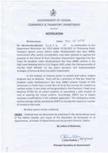ଭୁବନେଶ୍ଵର: ରାଜ୍ୟରେ ସ୍କୁଲ ପିଲାଙ୍କ ପାଇଁ ଆରମ୍ଭ ହେବ ମାଗଣା ବସ୍ ସେବା। ମୁଖ୍ୟମନ୍ତ୍ରୀ ବସ ସେବା ଯୋଜନାରେ ପିଲାଙ୍କୁ ମାଗଣା ବସ ସେବା ଯୋଗାଇ ଦିଆଯିବ । ସ୍କୁଲ ଓ ଗଣଶିକ୍ଷା ବିଭାଗର ପ୍ରସ୍ତାବକୁ ରାଜ୍ୟ ସରକାରଙ୍କ ଅନୁମୋଦନ କଲେ ସରକାର । ଏ ନେଇ ପରିବହନ ବିଭାଗ ପକ୍ଷରୁ ବିଜ୍ଞପ୍ତି ପ୍ରକାଶ ପାଇଛି। ଡ୍ରପ ଆଉଟ ହ୍ରାସ କରିବାକୁ ଆରମ୍ଭ ହେବ ମାଗଣା ବସ୍ ସେବା। ଉଭୟ ଏସି ଓ ନନ ଏସି ବସ୍ରେ ଏହି ସେବା ଲାଗୁ ହେବ।ତେବେ ବସ୍ରେ ଯାତ୍ରା ବେଳେ ଛାତ୍ରଛାତ୍ରୀମାନେ ୟୁନିଫର୍ମରେ ରହିବା ସହ ଆଇକାର୍ଡ ପକାଇବେ । ବର୍ତ୍ତମାନ OSRTC ବସ୍ ରୁଟ ଓ ଟାଇମିଂରେ ସଂଶୋଧନ କରିବ । ସଂଶୋଧିତ ରୁଟ୍ ରେ ସର୍ବାଧିକ ସ୍କୁଲ ଥିବା ରାସ୍ତାକୁ ସାମିଲ କରାଯିବ।