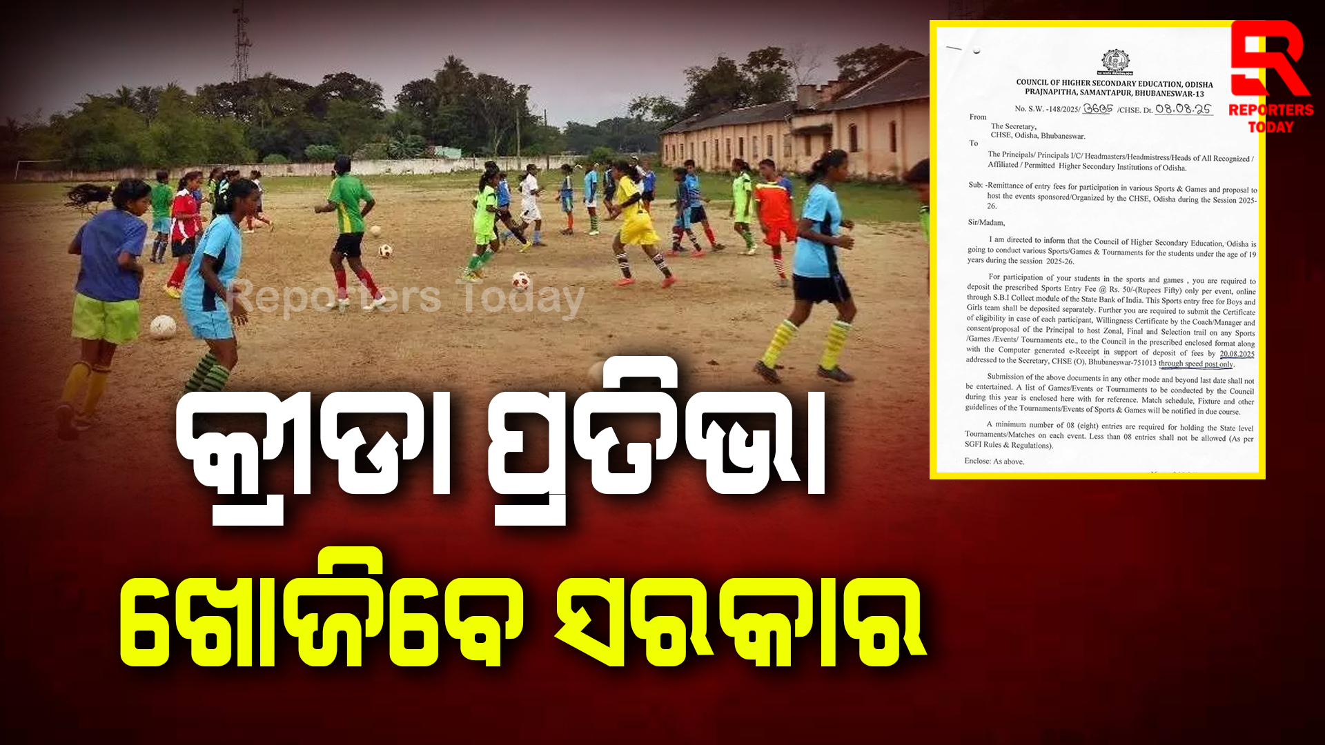 ରିପୋର୍ଟର୍ସ ବ୍ୟୁରୋ ; କଲେଜରୁ କ୍ରୀଡା ପ୍ରତିଭା ଖୋଜିବେ ସରକାର । ଯୁକ୍ତ ଦୁଇ କଲେଜରେ କ୍ରୀଡା ପ୍ରତିଯୋଗିତା କରିବେ ରାଜ୍ୟସରକାର । ରାଜ୍ୟର ସମସ୍ତ ଯୁକ୍ତି ଦୁଇ କଲେଜରେ ହେବ କ୍ରୀଡା ପ୍ରତିଯୋଗିତା ।ଏନେଇ ସମସ୍ତ ଶିକ୍ଷାନୁଷ୍ଠାନର ଅଧକ୍ଷ୍ୟ ମାନଙ୍କୁ ଉଚ୍ଚ ମାଧ୍ୟମିକ ଶିକ୍ଷା ପରିଷଦ ପକ୍ଷରୁ ଚିଠି ।୧୯ ବର୍ଷରୁ କମ ଛାତ୍ର ଛାତ୍ରୀଙ୍କୁ ନେଇ ଆୟୋଜନ ହେବ ବିଭିନ୍ନ କ୍ରୀଡା ପ୍ରତିଯୋଗିତା । କବାଡି, ଖୋଖୋ, ଫୁଟବଲ ହକି ଭଳି ୩୫ ଟି ପ୍ରତିଯୋଗିତା କାର୍ୟ୍ୟକ୍ରମ ଆୟୋଜନ ପାଇଁ ଚିଠି ମାଧ୍ୟମ ରେ ନିର୍ଦେଶ । ଅକ୍ଟୋବର, ନଭେମ୍ବର ଓ ଡିସେମ୍ବର ୩ ମାସ ଧରି ଚାଲିବ କ୍ରୀଡା ପ୍ରତିଯୋଗିତା ।