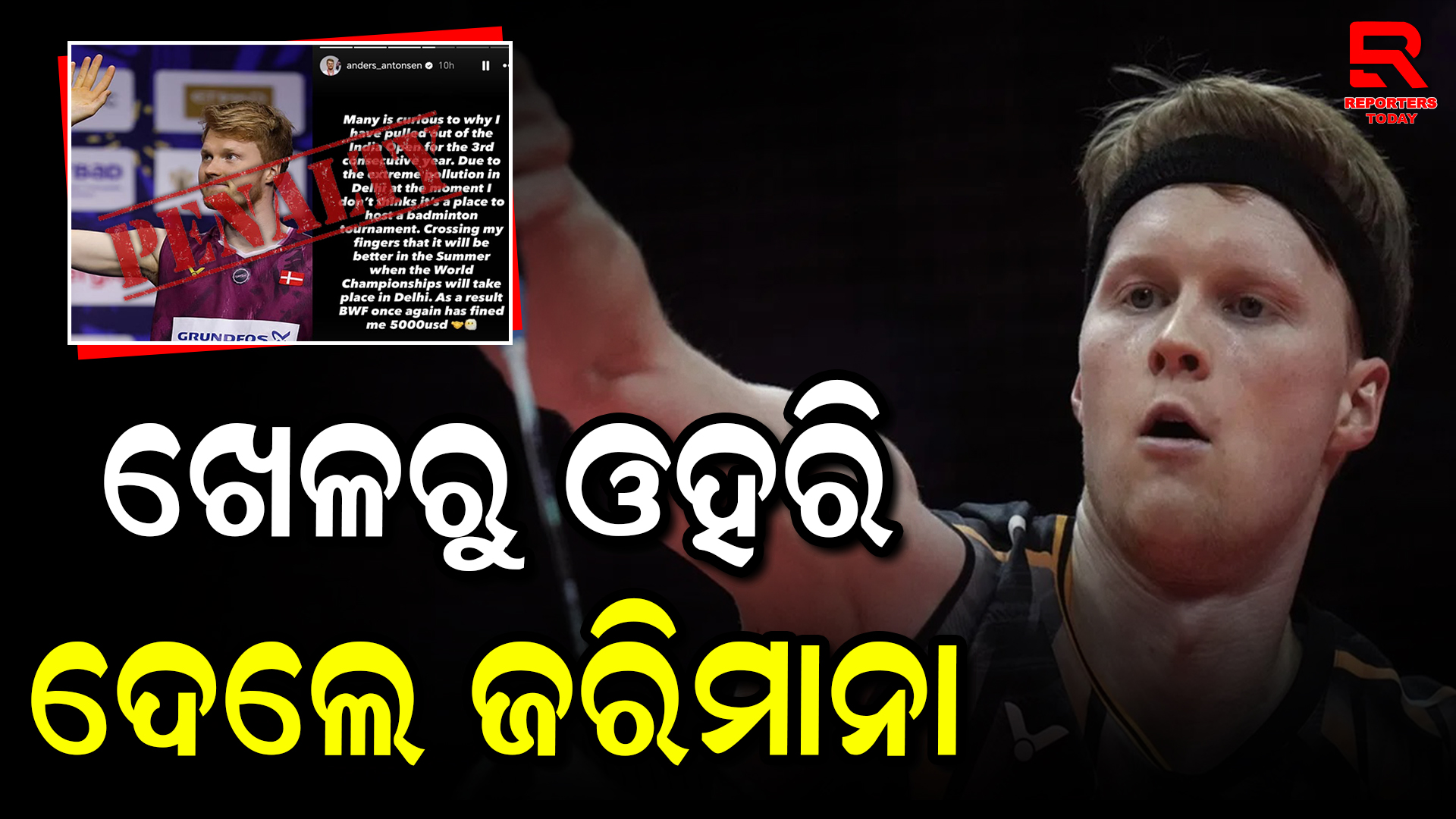 ଦିଲ୍ଲୀରେ ଖେଳିବାକୁ ମନା କରିବାରୁ ଚାରିଥର ର ବ୍ୟାଡମିଣ୍ଟନ ବିଶ୍ୱ ଚାମ୍ପିଅନ ଥିବା ଆଣ୍ଡର୍ସ ଆଣ୍ଟୋନସେନଙ୍କୁ ପ୍ରାୟ ୪.୫ ଲକ୍ଷ ଟଙ୍କାର ଜରିମାନା କରାଯାଇଛି । ସହରର ଉଚ୍ଚ ବାୟୁ ପ୍ରଦୂଷଣ ଯୋଗୁଁ ଆଣ୍ଟୋନସେନ ଦିଲ୍ଲୀରେ ଚାଲିଥିବା ଇଣ୍ଡିଆନ ଓପନ୍‌ରେ ଅଂଶଗ୍ରହଣ କରିବାକୁ ମନା କରିଥିଲେ । ଆଣ୍ଟୋନସେନ ତାଙ୍କ ଇନଷ୍ଟାଗ୍ରାମ ପୃଷ୍ଠାରେ ଏହା ପ୍ରକାଶ କରି  ଲେଖିଛନ୍ତି, “ଅନେକ ଲୋକ ଜାଣିବାକୁ ଚାହାଁନ୍ତି ଯେ ମୁଁ ଲଗାତାର ତୃତୀୟ ବର୍ଷ ପାଇଁ ଇଣ୍ଡିଆ ଓପନ୍‌ରୁ କାହିଁକି ଓହରିଗଲି । ଦିଲ୍ଲୀରେ ବର୍ତ୍ତମାନର ଉଚ୍ଚ ପ୍ରଦୂଷଣ ଯୋଗୁଁ ମୁଁ ଏହି ନିଷ୍ପତ୍ତି ନେଇଛି । ମୁଁ ଭାବୁନାହିଁ ଯେ ଦିଲ୍ଲୀ ବ୍ୟାଡମିଣ୍ଟନ ଟୁର୍ଣ୍ଣାମେଣ୍ଟ ଆୟୋଜନ କରିବା ପାଇଁ ସଠିକ୍ ସ୍ଥାନ ।”