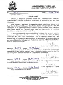 କର୍ତ୍ତବ୍ୟରେ ଅବହେଳା ପାଇଁ ଜେଲର ସନ୍ତୋଷିନୀ ଦାଶ ହୋଇଛନ୍ତି କାର୍ଯ୍ୟାନୁଷ୍ଠାନର ଶିକାର । କଣ୍ଟାବାଞ୍ଜି ଉପକାରାଗାରର ଜେଲର ତଥା ସୁପରିଟେଣ୍ଡେଣ୍ଟ ସନ୍ତୋଷିନୀ ଦାଶଙ୍କୁ ନିଲମ୍ବନ କରାଯାଇଛି । ଚୌଦ୍ୱାରରୁ କଣ୍ଟାବାଞ୍ଜିକୁ ବଦଳି ହୋଇଥିଲେ ହେଁ ସେ କାର୍ଯ୍ୟରେ ଯୋଗ ଦେଇ ନଥିଲେ । ସ୍ୱାସ୍ଥ୍ୟଗତ କାରଣ ଦର୍ଶାଇ ସେ ଛୁଟିରେ ଥିବା କହିଥିଲେ ମଧ୍ୟ କର୍ତ୍ତବ୍ୟରେ ଅବହେଳା ଓ ଅସଦାଚରଣ ପାଇଁ ଜେଲ୍ ଡିଜି ସୁଶାନ୍ତ ନାଥ ତାଙ୍କୁ ସସ୍ପେଣ୍ଡ୍ କରିଛନ୍ତି । ନିଲମ୍ବନ ପରେ ମୁଖ୍ୟାଳୟ ରେ ରହିବେ ସନ୍ତୋଷିନୀ ଦାଶ।