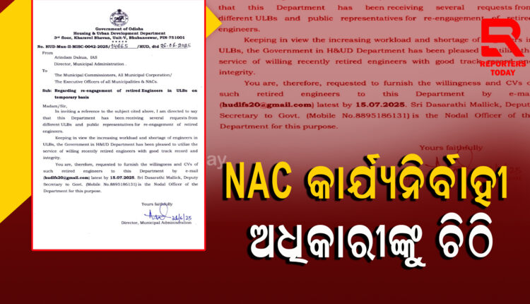 ଭୁବନେଶ୍ୱର;-ରାଜ୍ୟର ସମସ୍ତ ପୌର କମିଶନର, ପୌର ନିଗମ/ପୌର ପାଳିକା ଏବଂ NAC ର କାର୍ଯ୍ୟନିର୍ବାହୀ ଅଧିକାରୀଙ୍କୁ ଚିଠି ।  ଅବସରପ୍ରାପ୍ତ ଇଞ୍ଜିନିୟରମାନଙ୍କୁ ଅସ୍ଥାୟୀ ଭାବରେ ପୌର ସଂସ୍ଥା ରେ ନିଯୁକ୍ତି ପାଇଁ ଚିଠି । ଅବସରପ୍ରାପ୍ତ ଇଞ୍ଜିନିୟରମାନଙ୍କୁ ପୁନଃ ନିଯୁକ୍ତି ପାଇଁ ବିଭିନ୍ନ ପୌର ସଂସ୍ଥା ଏବଂ ଜନପ୍ରତିନିଧି ମାନଙ୍କ ଠାରୁ ଅନେକ ଅନୁରୋଧ ଆସୁଥିବାରୁ ପୌର ସଂସ୍ଥା ରେ ବର୍ଦ୍ଧିତ କାର୍ଯ୍ୟଭାର ଏବଂ ଇଞ୍ଜିନିୟରଙ୍କ ଅଭାବକୁ ଦୃଷ୍ଟିରେ ରଖି, ସରକାର ମାନବ ସମ୍ବଳ ଏବଂ ଭଲ ଟ୍ରାକ ରେକର୍ଡ ଥିବା ଅବସରପ୍ରାପ୍ତ ଇଞ୍ଜିନିୟର ମାନଙ୍କୁ ପୁନଃ ନିଯୁକ୍ତି ପାଇଁ ଚିଠିରେ ଉଲ୍ଲେଖ କରିଛନ୍ତି ।