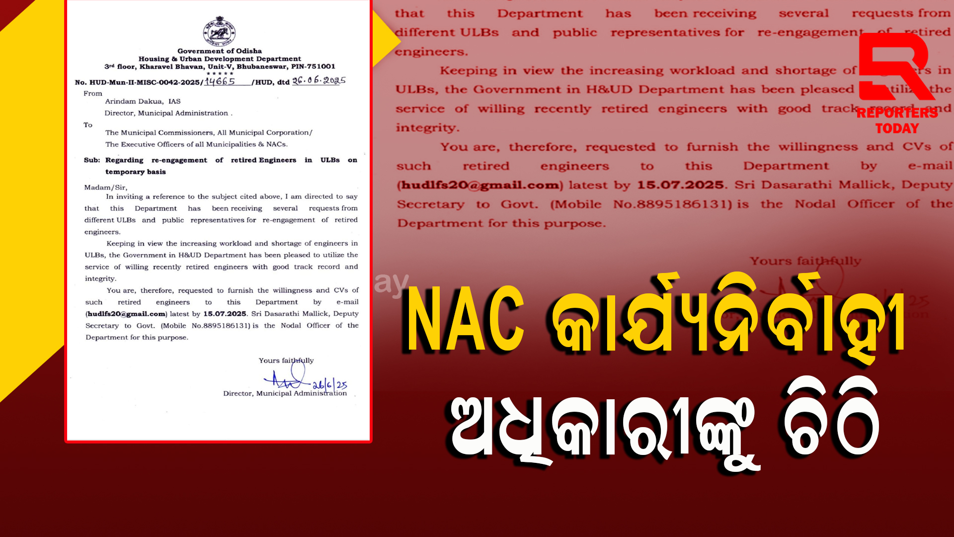 ଭୁବନେଶ୍ୱର;-ରାଜ୍ୟର ସମସ୍ତ ପୌର କମିଶନର, ପୌର ନିଗମ/ପୌର ପାଳିକା ଏବଂ NAC ର କାର୍ଯ୍ୟନିର୍ବାହୀ ଅଧିକାରୀଙ୍କୁ ଚିଠି । ଅବସରପ୍ରାପ୍ତ ଇଞ୍ଜିନିୟରମାନଙ୍କୁ ଅସ୍ଥାୟୀ ଭାବରେ ପୌର ସଂସ୍ଥା ରେ ନିଯୁକ୍ତି ପାଇଁ ଚିଠି । ଅବସରପ୍ରାପ୍ତ ଇଞ୍ଜିନିୟରମାନଙ୍କୁ ପୁନଃ ନିଯୁକ୍ତି ପାଇଁ ବିଭିନ୍ନ ପୌର ସଂସ୍ଥା ଏବଂ ଜନପ୍ରତିନିଧି ମାନଙ୍କ ଠାରୁ ଅନେକ ଅନୁରୋଧ ଆସୁଥିବାରୁ ପୌର ସଂସ୍ଥା ରେ ବର୍ଦ୍ଧିତ କାର୍ଯ୍ୟଭାର ଏବଂ ଇଞ୍ଜିନିୟରଙ୍କ ଅଭାବକୁ ଦୃଷ୍ଟିରେ ରଖି, ସରକାର ମାନବ ସମ୍ବଳ ଏବଂ ଭଲ ଟ୍ରାକ ରେକର୍ଡ ଥିବା ଅବସରପ୍ରାପ୍ତ ଇଞ୍ଜିନିୟର ମାନଙ୍କୁ ପୁନଃ ନିଯୁକ୍ତି ପାଇଁ ଚିଠିରେ ଉଲ୍ଲେଖ କରିଛନ୍ତି ।