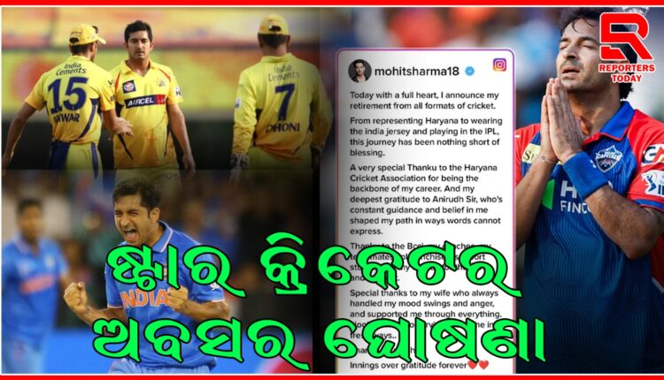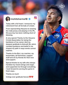ମୋହିତ ଶର୍ମା ସୋସିଆଲ ମିଡିଆରେ ତାଙ୍କର ଅବସର ଘୋଷଣା କରିଛନ୍ତି। ସେ ଏକ ଇନଷ୍ଟାଗ୍ରାମ ପୋଷ୍ଟରେ ଲେଖିଛନ୍ତି, ଆଜି ମୁଁ କ୍ରିକେଟର ସମସ୍ତ ଫର୍ମାଟରୁ ଅବସର ଘୋଷଣା କରୁଛି। ସେ ହରିଆଣା ପାଇଁ ହେଉ କି ଦେଶ ପାଇଁ କିମ୍ବା IPL ପାଇଁ ହେଉ ଏହି ଯାତ୍ରା ମୋ ପାଇଁ ଏକ ଆଶୀର୍ବାଦ ହୋଇଛି। ମୋ କ୍ୟାରିୟରର ମେରୁଦଣ୍ଡ ହୋଇଥିବାରୁ ହରିୟାଣା କ୍ରିକେଟ ଆସୋସିଏଶନକୁ ବହୁତ ବହୁତ ଧନ୍ୟବାଦ। ମୁଁ ଅନିରୁଦ୍ଧ ସାର୍ଙ୍କୁ ମଧ୍ୟ ହୃଦୟରୁ ଧନ୍ୟବାଦ ଜଣାଉଛି। ସେ ମୋ ପାଇଁ ଯାହା କରିଛନ୍ତି ତାହା ଶବ୍ଦରେ ପ୍ରକାଶ କରାଯାଇପାରିବ ନାହିଁ।
