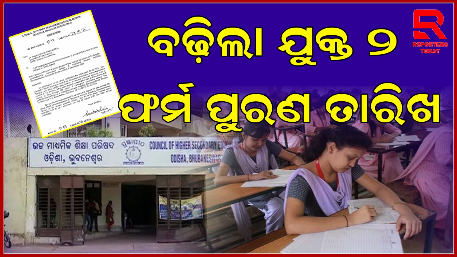 ଖବର ଅନୁଯାୟୀ, ୨୦୨୬ ଯୁକ୍ତ ଦୁଇ ପରୀକ୍ଷା ଲାଗି ଫର୍ମ ପୂରଣ ଅକ୍ଟୋବର ୨୮ରେ ହେବାର ଥିଲା । ହେଲେ ବାତ୍ୟା ମୋନ୍ଥା ଲାଗି ଫର୍ମ ପୂରଣ ହୋଇପାରିନାହିଁ । ଯାହାକୁ ନେଇ ଅନେକ କଲେଜରେ ଫର୍ମ ପୂରଣ ହୋଇପାରିନଥିଲା । ଶେଷରେ ଅନେକ କଲେଜ ବୋର୍ଡକୁ ତାରିଖ ଅବଧିକୁ ବୃଦ୍ଧି କରିବା ଲାଗି ନିବେଦନ କରିଥିଲେ । କଲେଜଙ୍କ ଆବେଦନକୁ ବିଚାରକୁ ନେଇ ବୋର୍ଡ ପକ୍ଷରୁ ନିଷ୍ପତ୍ତି ନିଆଯାଇଛି । ଯୁକ୍ତ ଦୁଇ ଫର୍ମପୂରଣ ପାଇଁ ତାରିଖ ନଭେମ୍ବର ୩ ତାରିଖ ଯାଏଁ ଘୁଞ୍ଚାଇଛନ୍ତି ବୋର୍ଡ କର୍ତ୍ତୃପକ୍ଷ ।