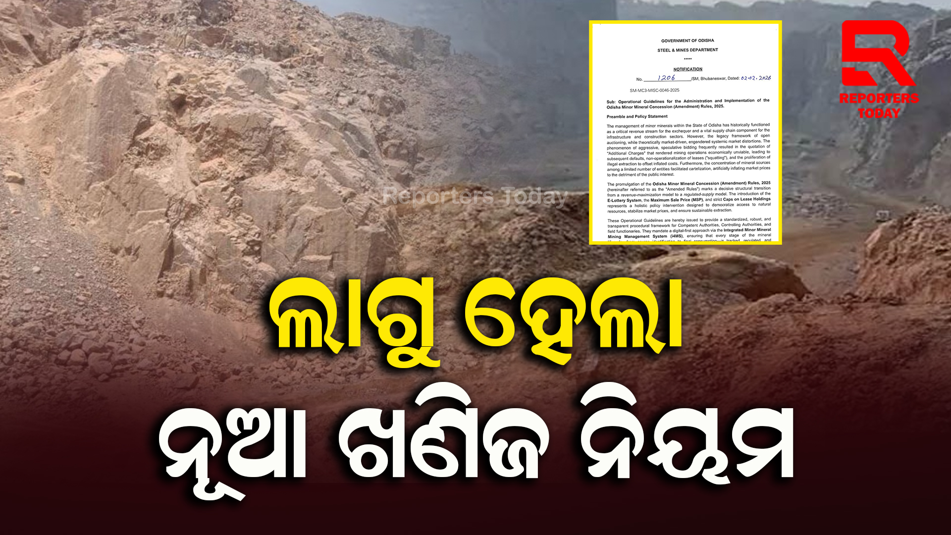 ଲାଗୁ ହେଲା ନୂଆ ଖଣିଜ ନିୟମ। ଏଣିକି ନିଲାମ ନୁହେଁ ଇ-ଲଟେରୀରେ ବାଲି ଓ ପଥର ଖଣି ଲିଜ୍ ମିଳିବ । ନୂଆ ଗାଇଡଲାଇନ୍ ଅନୁସାରେ, ଏକଚାଟିଆ କାରବାର ବା କାର୍ଟେଲାଇଜେସନ୍ ରୋକିବା ପାଇଁ ସରକାର ଇ-ଅକ୍ସନ ବା ନିଲାମ ବନ୍ଦ କରି ଇ-ଲଟେରୀ ବ୍ୟବସ୍ଥା ଆରମ୍ଭ କରିଛନ୍ତି । ଏଣିକି ଏମଏସପି ଧାର୍ଯ୍ୟ କରିବେ ସରକାର । ଖଣି ମାଫିଆଙ୍କ ଉପରେ ଲାଗିବ ଅଙ୍କୁଶ । ଲଘୁ ଖଣିଜ ସମ୍ପଦର ଲିଜ୍ ପାଇଁ ନିଲାମ ଡକା ହେବ ନାହିଁ, ବରଂ ସରକାରଙ୍କ ଦ୍ୱାରା ଧାର୍ଯ୍ୟ ସ୍ଥିର ଅତିରିକ୍ତ ଚାର୍ଜରେ ଇ-ଲଟେରୀ ମାଧ୍ୟମରେ ଯୋଗ୍ୟ ବ୍ୟକ୍ତିଙ୍କୁ ଚୟନ କରାଯିବ । ଆବେଦନକାରୀଙ୍କୁ ଏମଏସଟିସି ପୋର୍ଟାଲରେ ‘ଫର୍ମ-ସି’ରେ ଅନଲାଇନରେ ଆବେଦନ କରିବାକୁ ପଡ଼ିବ । ୧୦ହଜାର ଟଙ୍କା ଅଣଫେରସ୍ତ ଆବେଦନ ଫି\’ ଜମା ସହ ୧୦% ଅମାନତ ରାଶି (ଇଏମଡି) ଜମା କରିବାକୁ ପଡ଼ିବ । ଆବେଦନ ସହିତ ପରିବାରର ସମସ୍ତ ସଦସ୍ୟଙ୍କ ନାମ ଥିବା ଏକ ସତ୍ୟପାଠ ଦାଖଲ କରିବା ବାଧ୍ୟତାମୂଳକ । ପ୍ରତ୍ୟେକ ଆବେଦନର ସୂକ୍ଷ୍ମ ଯାଂଚ ପାଇଁ ଏକ ଜିଲ୍ଲାସ୍ତରୀୟ ଟେକ୍ନିକାଲ୍ ଯାଂଚ କମିଟି ଗଠନ କରାଯାଇଛି । ସଂପୂର୍ଣ୍ଣ ପ୍ରକ୍ରିୟାକୁ ଡିଜିଟାଲ୍ କରାଯାଇଥିବାରୁ ଏଥିରେ କୌଣସି ହେରଫେର ମଧ୍ୟ ହୋଇପାରିବ ନାହିଁ । ଯେଉଁମାନେ ପୂର୍ବରୁ ନିଲାମ ମାଧ୍ୟମରେ ଲିଜ୍ ପାଇଛନ୍ତି, ସେମାନେ ମଧ୍ୟ ଚାହିଁଲେ ନୂଆ ନିୟମ ଅନୁଯାୟୀ ମାଇଗ୍ରେଟ୍ ବା ସାମିଲ ହୋଇପାରିବେ । ବଜାରରେ ବାଲି ଓ ପଥରର ଚଢ଼ା ଦରକୁ ରୋକିବା ପାଇଁ ସରକାର ପ୍ରଥମ କରି ‘ସର୍ବାଧିକ ବିକ୍ରୟ ମୂଲ୍ୟ\’ (ଏମଏସପି) ଧାର୍ଯ୍ୟ କରିଛନ୍ତି । ଲିଜଧାରୀମାନେ ସରକାରଙ୍କ ଦ୍ୱାରା ନିର୍ଦ୍ଧାରିତ ମୂଲ୍ୟରୁ ଅଧିକ ଟଙ୍କା ଗ୍ରାହକଙ୍କ ଠାରୁ ନେଇପାରିବେ ନାହିଁ । ଏହି ମୂଲ୍ୟରେ ଉତ୍ପାଦନ ଖର୍ଚ୍ଚ ଓ ଟିକସ ସହ କେବଳ ୧୫% ଲାଭ ରହିବ ।