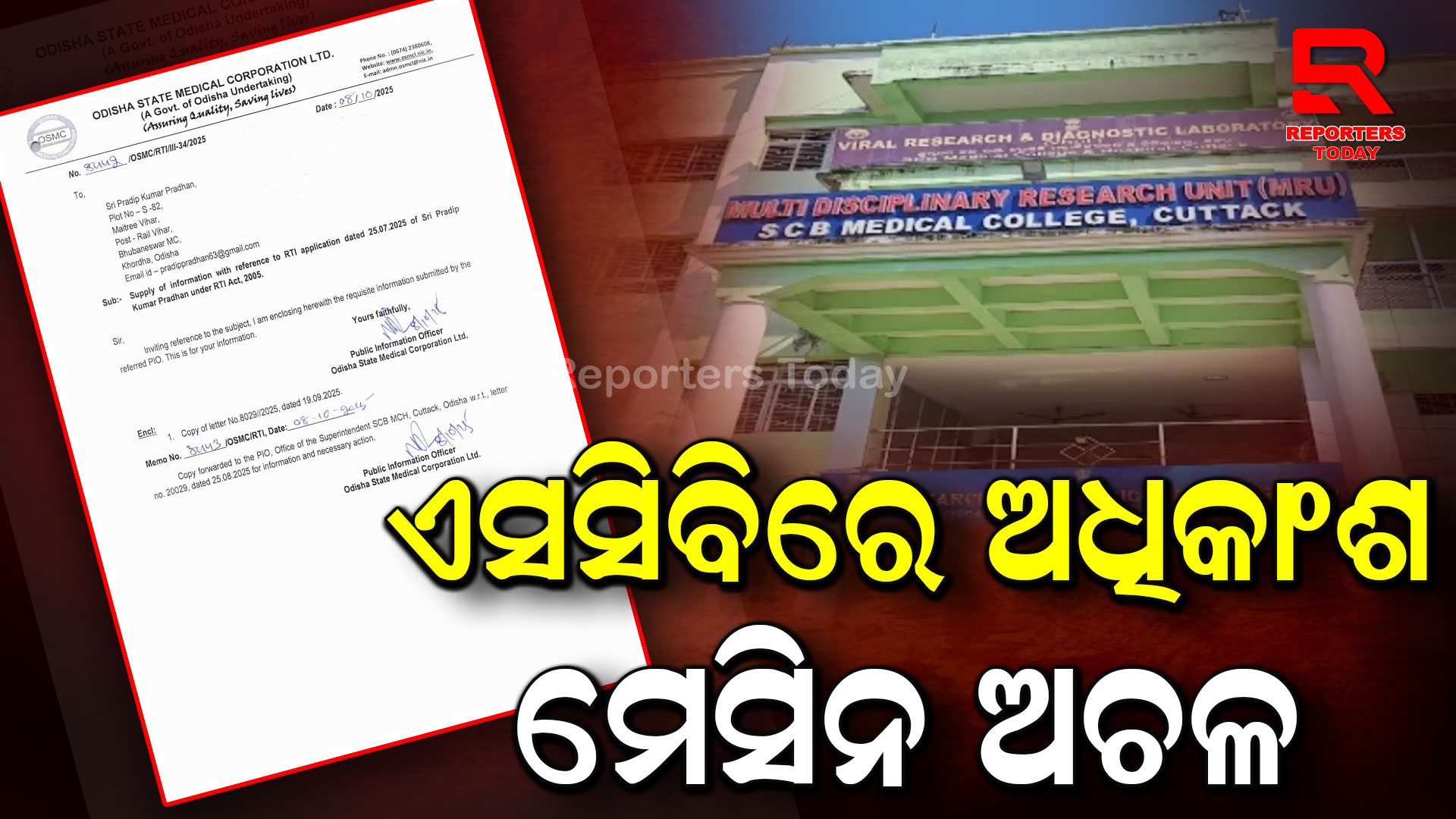 କଟକ:- ସୂଚନା ଅଧିକାର ଆଇନରେ ମିଳିଥିବା ତଥ୍ୟ ଅନୁଯାୟୀ ରାଜ୍ୟର ସର୍ବ ବୃହତ ସରକାରୀ ସ୍ବାସ୍ଥ୍ୟ କେନ୍ଦ୍ର ଏସସିବି ମେଡିକାଲରେ ସଂଖ୍ୟାଧିକ ମେସିନ ଅଚଳ ଅବସ୍ଥାରେ ଖରାପ ହୋଇ ପଡ଼ିରହିଛି । ଏସସିବିରେ ମେସିନ ଗୁଡିକ ବହୁ ଦିନ ହେବ ଅଚଳ ହେବା ଯୋଗୁଁ ଏସସିବିକୁ ଆସୁଥିବା ରୋଗୀମାନେ ବହୁ ଅସୁବିଧାର ସମ୍ମୁଖୀନ ହେଉଛନ୍ତି । ବହୁ ମେସିନ ଖରାପ ଥିବାରୁ ଡାକ୍ତର ମାନେ ରୋଗୀଙ୍କୁ ଫେରାଇ ଦେଉଛନ୍ତି । ଏସସିବିକୁ ନୂଆ ମେସିନ କିମ୍ବା ମେସିନ ଗୁଡିକୁ ମରାମତି ପାଇଁ ରୋଗୀ ଓ ରୋଗୀଙ୍କ ସମ୍ପର୍କୀୟ ଓ ସାଧାରଣରେ ଦାବି ହେଉଥିଲେବି ସେଗୁଡିକୁ ମରାମତି କରାଯାଉ ନାହିଁ l ଏଥିରୁ ସ୍ପଷ୍ଟ ଅନୁମେୟ କରାଯାଇପାରୁଛି ରୋଗୀ ସେବା କିପରି ଚାଲୁଥିବ।