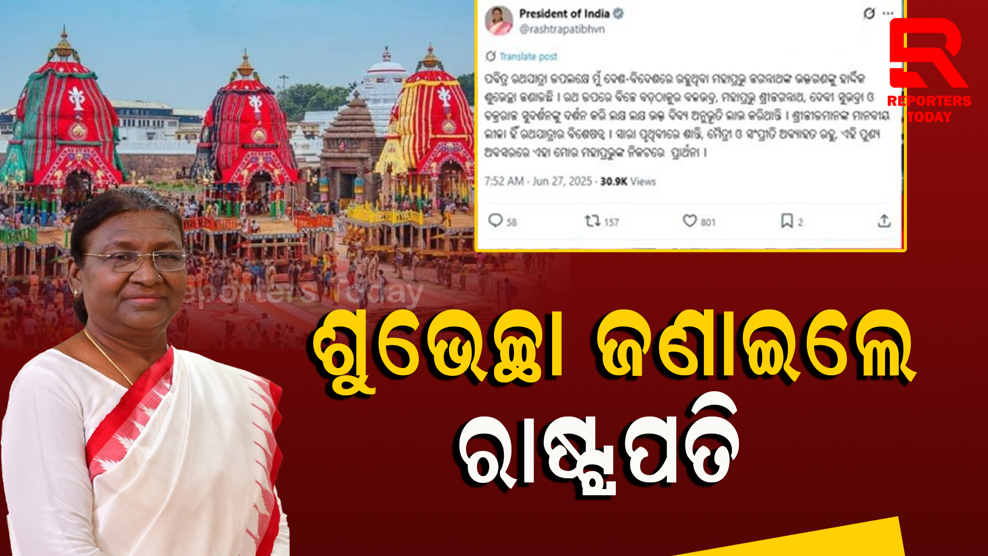 ରିପୋର୍ଟର୍ସ ଟୁଡେ ବ୍ୟୁରୋ;- ଆଜି ହେଉଛି ପବିତ୍ର ଘୋଷଯାତ୍ରା । ଭକ୍ତ ଓ ଭଗବାନଙ୍କ ମିଳନ । ବଡଦାଣ୍ଡ ଉଚ୍ଛୁଳି ପଡୁଛି । କାଳିଆ ସାଆନ୍ତଙ୍କୁ ଦେଖି ଆଖିରେ ଲୁହ ଝରିପଡୁଛି । ତେବେ ରଥଯାତ୍ରା ଅବସରରେ ଓଡିଶାବାସୀଙ୍କୁ ଶୁଭେଚ୍ଛା ଜଣାଇଛନ୍ତି ରାଷ୍ଟ୍ରପତି ଦୌପଦୀ ମୁର୍ମୁ । ଦେଶ-ବିଦେଶ ରହୁଥିବା ମହାପ୍ରଭୁ ଜଗନ୍ନାଥଙ୍କ ଭକ୍ତଗଣଙ୍କୁ ଶୁଭେଚ୍ଛା ଜଣାଇଛନ୍ତି ।ରଥ ରୂଢ ହୋଇଛନ୍ତି ତିନି ।