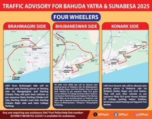 ପୁରୀ-: ପବିତ୍ର ବାହୁଡା ଯାତ୍ରା ଏବଂ ସୁନାବେଶ ସମୟରେ ସୁଗମ ଯାନବାହାନ ଚଳାଚଳ ଏବଂ ଉତ୍ତମ ଭିଡ଼ ପରିଚାଳନା ପାଇଁ ପୁରୀ ଜିଲ୍ଲା ପୋଲିସ ଗୁରୁବାର ଏକ ଟ୍ରାଫିକ ପରାମର୍ଶ ଜାରି କରିଛି। ପରାମର୍ଶ ଅନୁଯାଇ ଭୁବନେଶ୍ୱର, ବ୍ରହ୍ମଗିରି ଏବଂ କୋଣାର୍କରୁ ପୁରୀକୁ ଆସୁଥିବା ବିଭିନ୍ନ ଯାନ ପାଇଁ ନିର୍ଦ୍ଦିଷ୍ଟ ରୁଟ୍ ଏବଂ ପାର୍କିଂ ସ୍ଥାନର ସୂଚନା ଦିଆଯାଇଛି।
