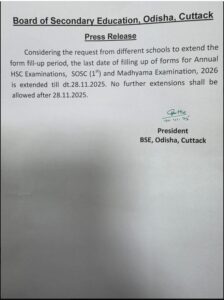 କଟକ: ମାଟ୍ରିକ ଫର୍ମ ଫିଲଅପ୍ ଅବଧି ବୃଦ୍ଧି କଲା ମାଧ୍ୟମିକ ଶିକ୍ଷା ପରିଷଦ (BSE) । ନଭେମ୍ବର ୨୮ ତାରିଖ ପର୍ଯ୍ୟନ୍ତ ବୃଦ୍ଧି ନେଇ ସୂଚନା ଜାରି । SOSC (ପ୍ରଥମ), ମଧ୍ୟମା ପାଇଁ ବି ୨୮ ପର୍ଯ୍ୟନ୍ତ ଫର୍ମ ଫିଲଅପ୍ କରିହେବ । ବିଦ୍ୟାଳୟର ମୁଖ୍ୟ ବା ପ୍ରଧାନଶିକ୍ଷକଙ୍କ ଦ୍ଵାରା ଛାତ୍ରଛାତ୍ରୀଙ୍କ ଫର୍ମପୂରଣ କରାଯିବ।