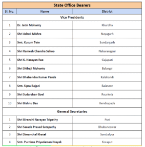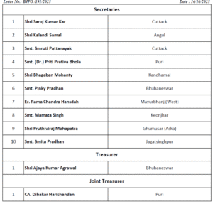 ସେହିପରି, ତାଲିକାରେ ବିରଞ୍ଚି ତ୍ରିପାଠୀ, ଶାରଦା ପ୍ରସାଦ ଶତପଥୀ ସୀମାଞ୍ଚଳ ଖଟେଇ, ପୂର୍ଣ୍ଣିମା ପ୍ରୀୟଦର୍ଶନୀ ନାୟକଙ୍କୁ ସା. ସମ୍ପାଦକ ଦାୟିତ୍ବ । ସମ୍ପାଦକରେ ସରୋଜ କୁମାର କର, କାଳନ୍ଦୀ ସାମଲ, ସ୍ମୃତି ପଟ୍ଟନାୟକ ପ୍ରୀତି ପ୍ରତିଭା ଭୋଳ, ଭଗବାନ ମହାନ୍ତି, ପିଙ୍କି ପ୍ରଧାନ, ରାମଚନ୍ଦ୍ର ହାଂସଦା ମମତା ସିଂ, ପୃଥ୍ବୀରାଜ ମହାପାତ୍ର, ସ୍ମିତା ପ୍ରଧାନଙ୍କୁ ଦାୟିତ୍ବ । ଏଥିସହ ଅଜୟ ଅଗ୍ରୱାଲ କୋଷାଧ୍ୟକ୍ଷ, ଦିବାକର ହରିଚନ୍ଦନଙ୍କୁ ଯୁଗ୍ମ କୋଷାଧ୍ୟକ୍ଷ ଦାୟିତ୍ଵ ଦିଆଯାଇଛି ।