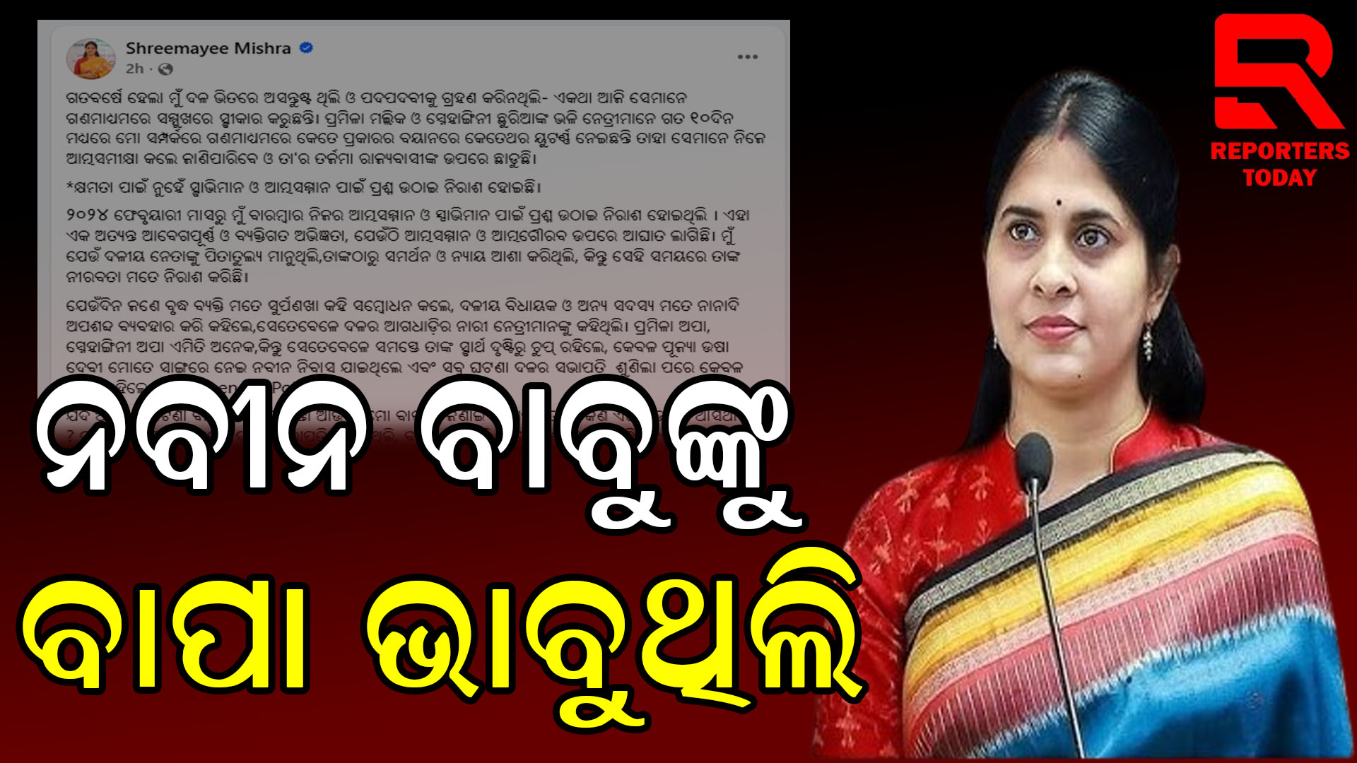 ଭୁବନେଶ୍ଵର: ପୁଣି ସୋସିଆଲ ମିଡିଆ ଜରିଆରେ ରୋଷ ଝାଡ଼ିଲେ ଶ୍ରୀମୟୀ ମିଶ୍ର । ନବୀନ ବାବୁଙ୍କୁ କେବଳ ଦଳର ସଭାପତି ଭାବିନଥିଲି, ବାପା ଭାବୁଥିଲି । ମୋ ପ୍ରତି ଅପଶବ୍ଦ ପ୍ରୟୋଗ ନେଇ ନବୀନ ନିବାସ ଯାଇ ଜଣାଇଥିଲି । ଦଳର ସଭାପତି ସବୁ ଶୁଣିଲା ପରେ କହିଲେ ରାଜନୀତିରେ ଏପରି ଘଟେ । ଏହି ଘଟଣା ହିଁ ମୋ ଜୀବନର ଟର୍ଣ୍ଣିଂ ପଏଣ୍ଟ ପାଲଟିଗଲା । ମତେ ଲାଗିଲା ସତରେ କ’ଣ ମୋ ବାପାଙ୍କ ସାମ୍ନାରେ ମୋର କିଛି ମହତ୍ତ୍ଵ ନାହିଁ । ସେତେବେଳେ ଦଳର ଆଗଧାଡ଼ିର ନାରୀ ନେତ୍ରୀ ସ୍ବାର୍ଥ ଦୃଷ୍ଟିରୁ ଚୁପ ରହିଲେ ।